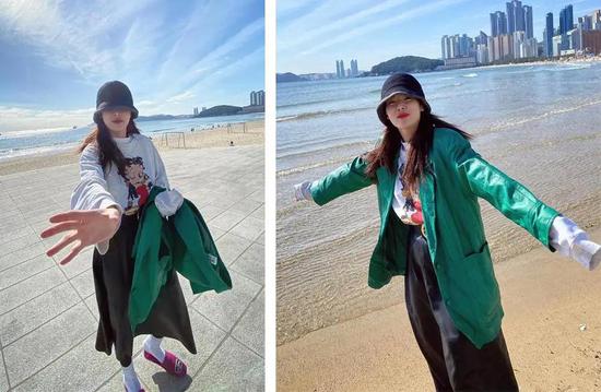 还有棕色,出现在街头很有氛围,也相当应季。腿细的可以下搭紧身裤,上宽下紧的效果显高显瘦,对小个子女生友好。