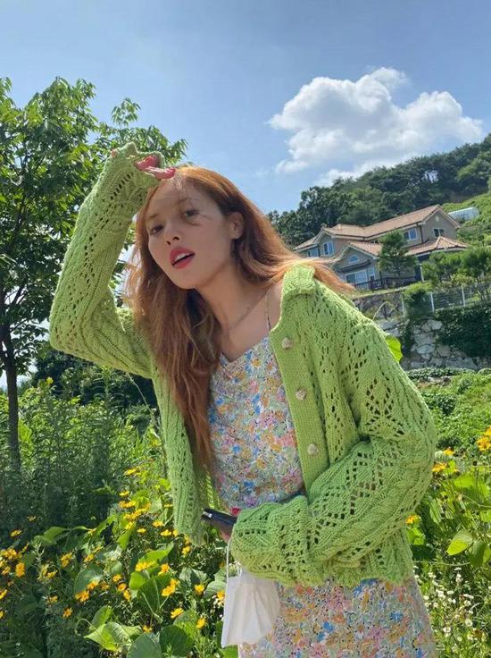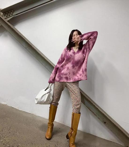 在夏天,泫雅就多次这么搭过,只是多穿一双彩色长袜或者靴子,就能让碎花裙趣味十足,风格洋气又复古,泫雅风这不就出来了么。