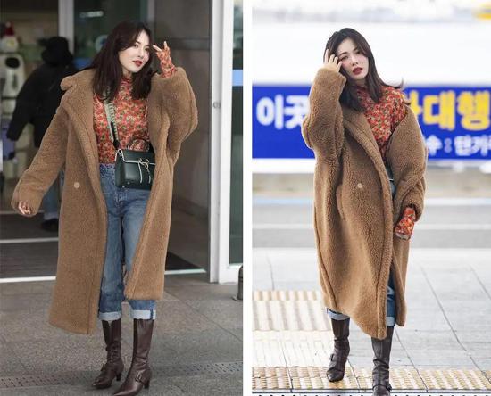温暖的泰迪熊大衣,可以和大面积印花穿到一块。不过小个子也别担心,用裤子和包包强调出高腰线,照样不会压个子。半露肩头的穿法新颖不单调。