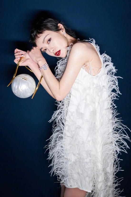 郭采洁身穿羽毛吊带裙,全身白羽摇曳似雪,凛冽中挺立傲然身姿,气场全开。